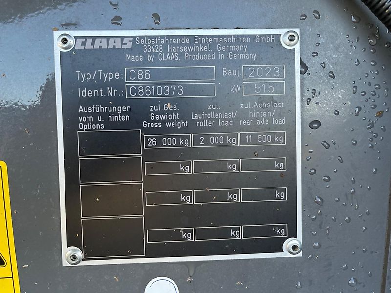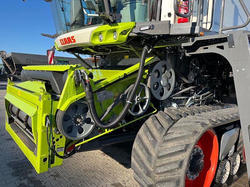 The 2023 CLAAS Lexion 8800 TT is a combine harvester with a 700 hp (515 kW) MAN D4276 16.2L, 6-cylinder engine. It features the APS Synflow Hybrid threshing system, a 70% separation increase from its pre-separation system, and an 18,000-liter grain tank. Standard and optional features include Terra Trac tracks, an advanced cabin with improved visibility and comfort, and the CEMOS AUTO COMPLETE system for automatic adjustments.