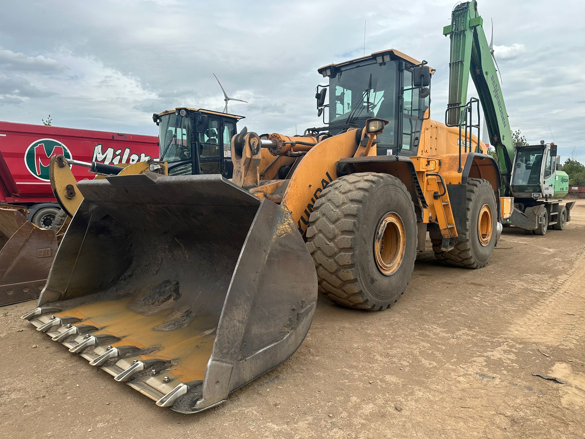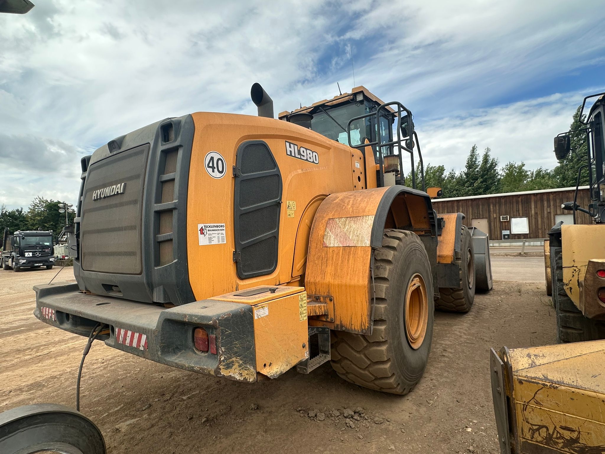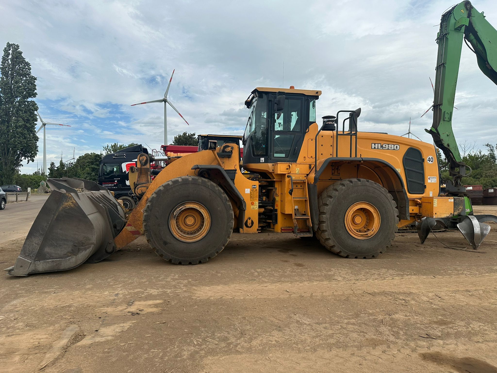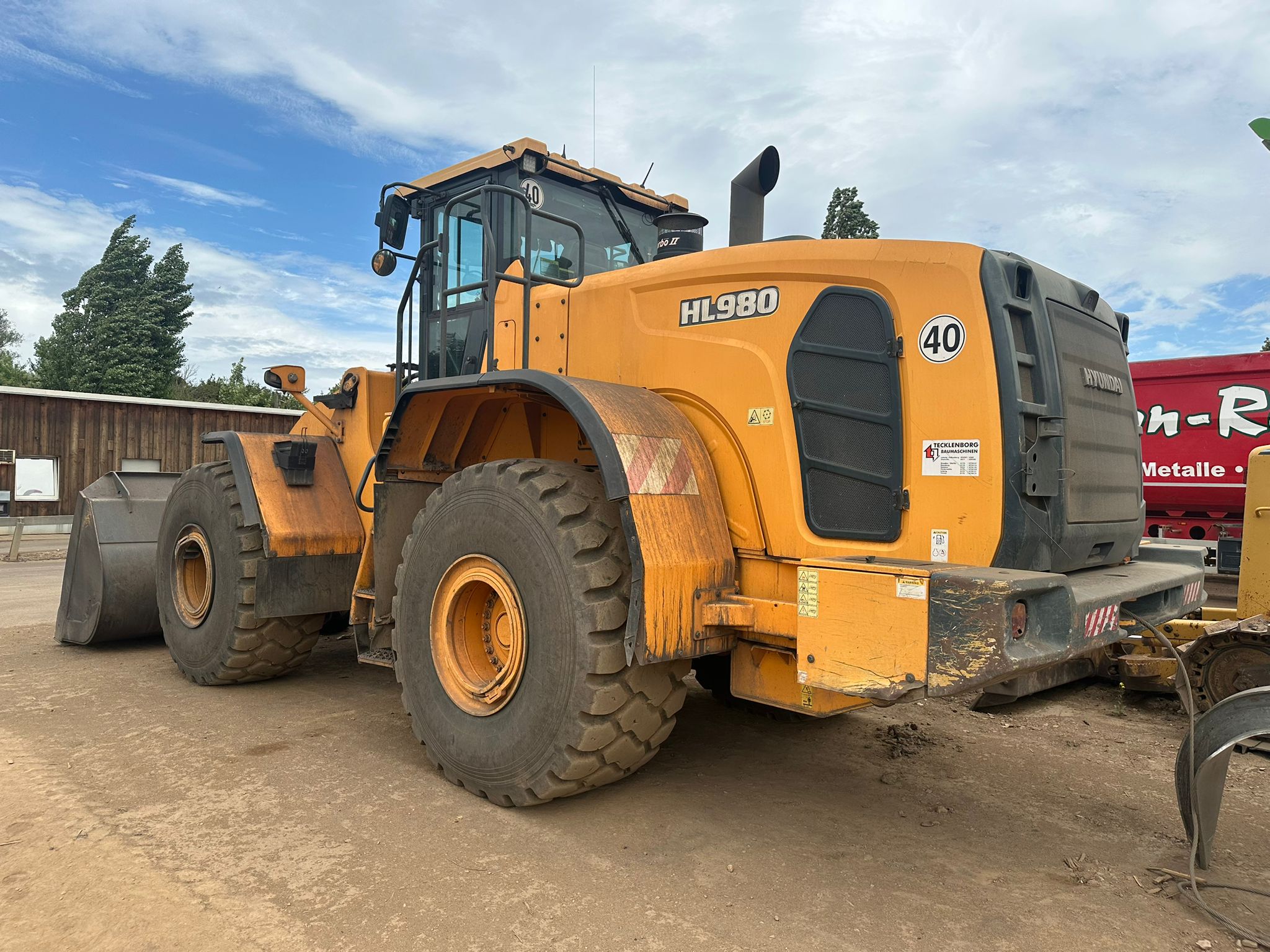 The 2019 Hyundai HL980 wheel loader features a Scania DC 13 turbocharged diesel engine producing 376 HP (280 kW) net power, a standard bucket capacity of 5.6 m³, and an operating weight of around 31,570 kg and a maximum travel speed of 40 km/h.