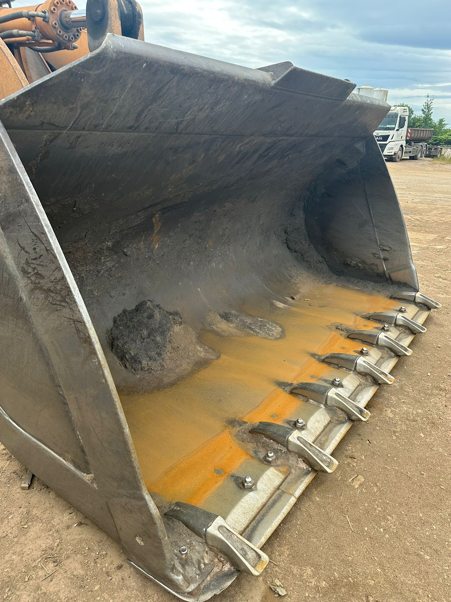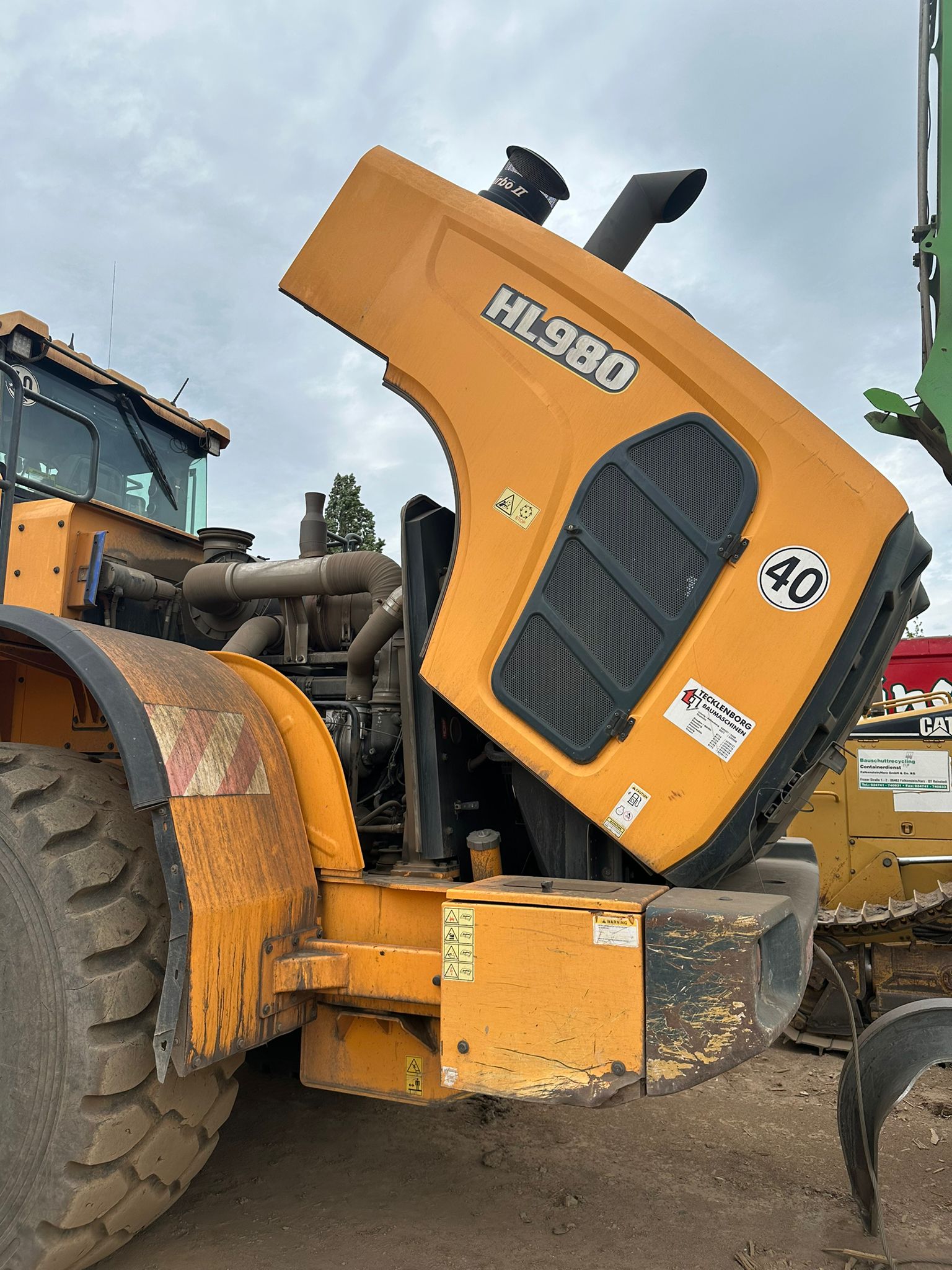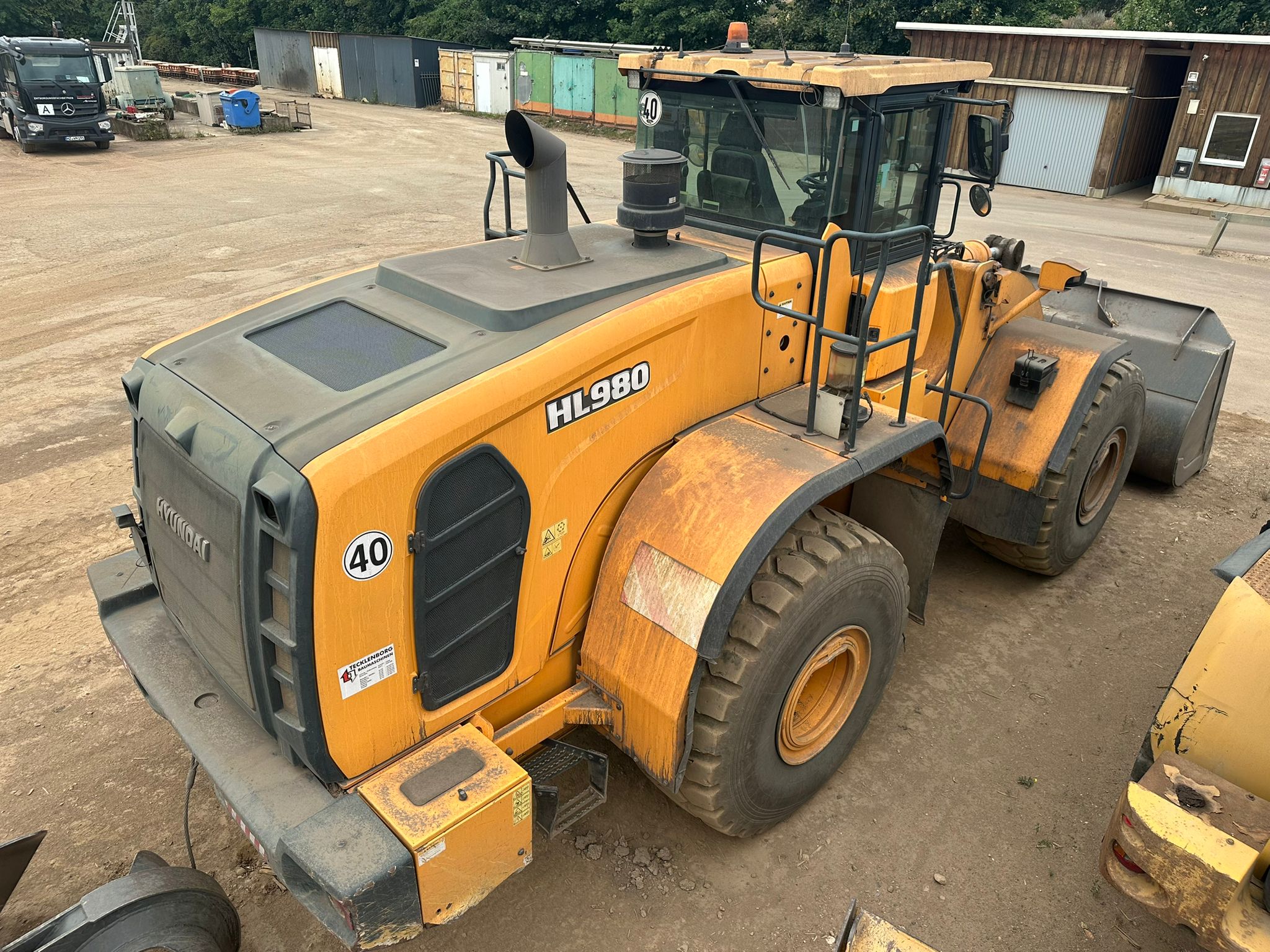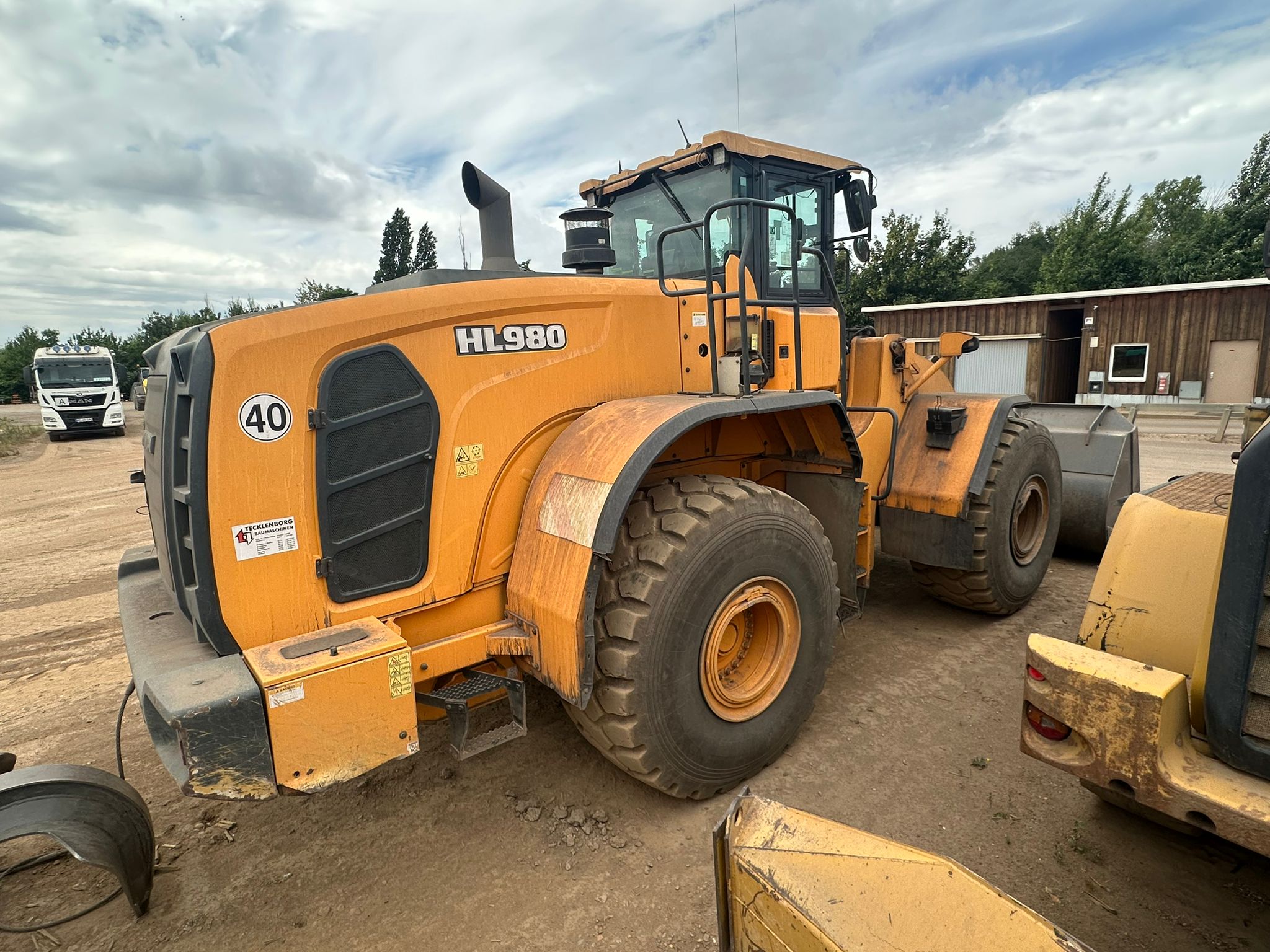 The 2019 Hyundai HL980 wheel loader features a Scania DC 13 turbocharged diesel engine producing 376 HP (280 kW) net power, a standard bucket capacity of 5.6 m³, and an operating weight of around 31,570 kg and a maximum travel speed of 40 km/h.