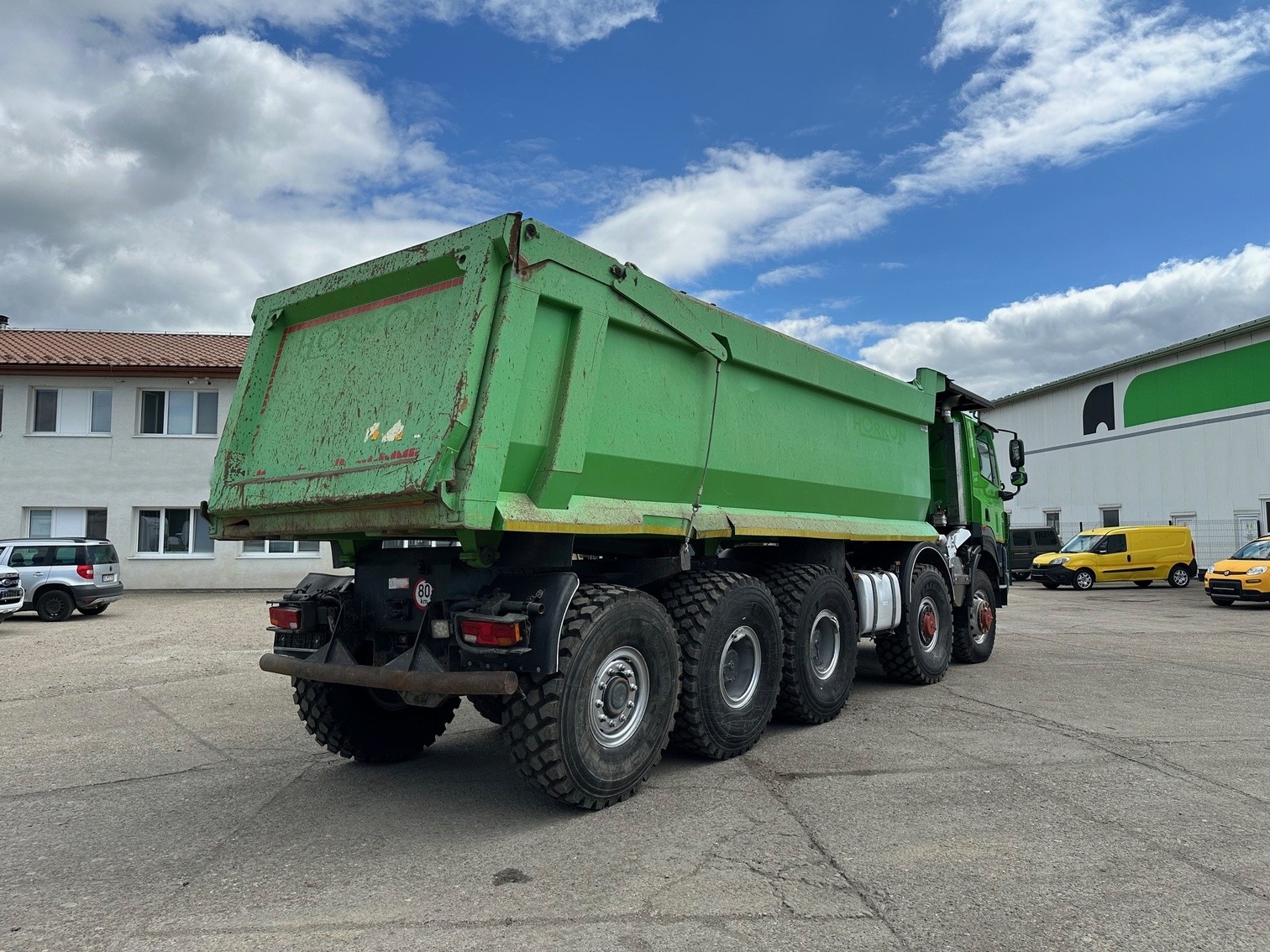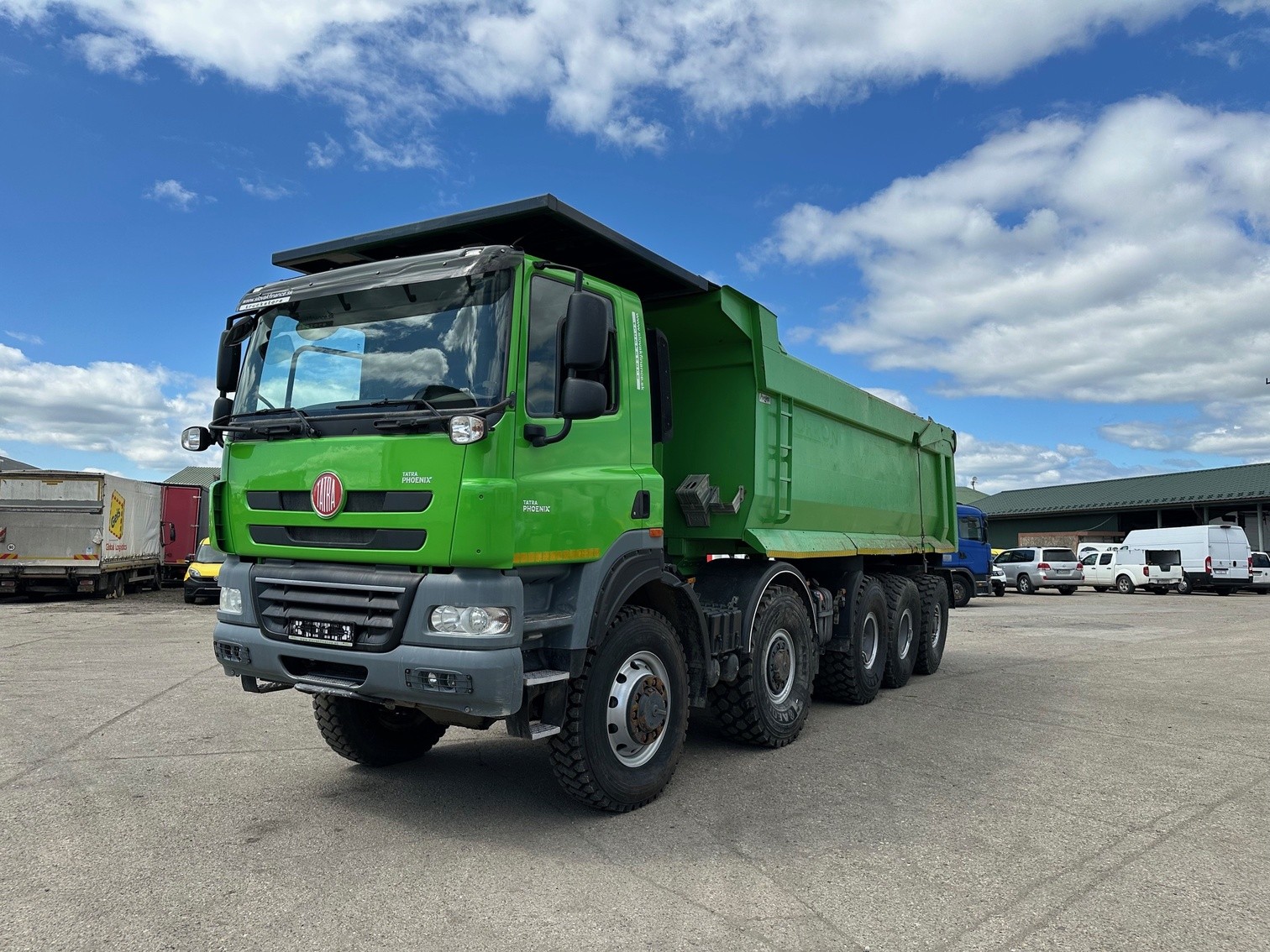 The 2015 Tatra T158 Phoenix 10×8 is a 5-axle dump truck with a 25 \(m^{3}\) body, 510 HP (375 kW) Euro 5 diesel engine, and a 12,902 cm³ engine volume. It features a 10×8 axle configuration and a 60,000 kg gross weight.